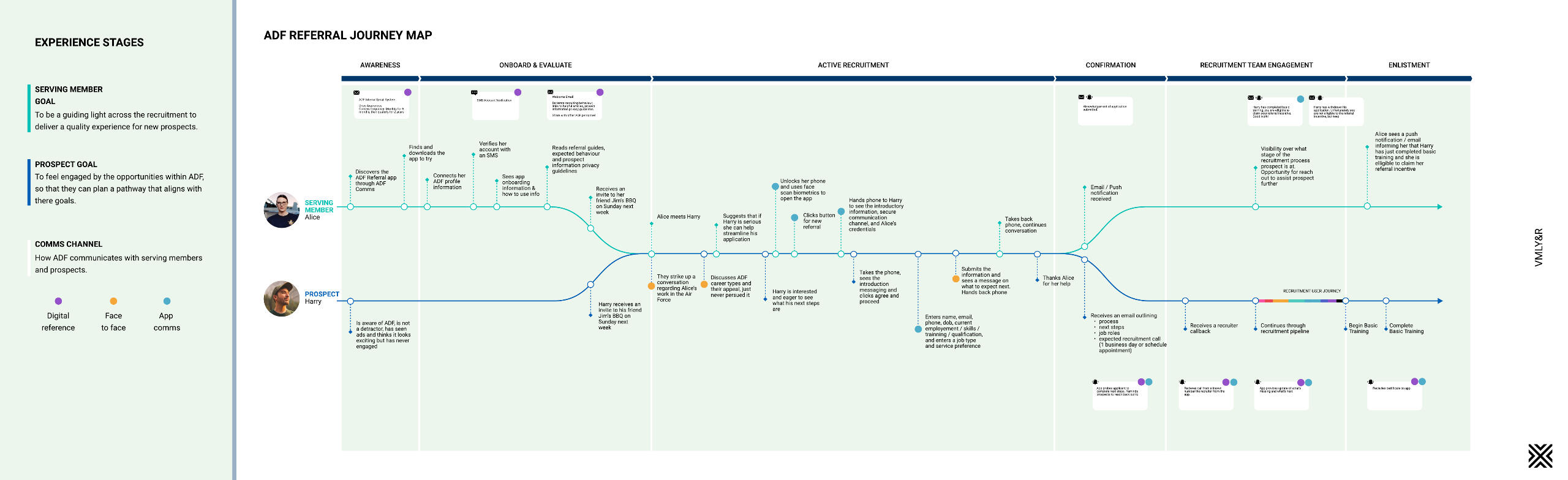 Tasked with reversing a decline in ADF applications, I led UX research and journey mapping across multiple streams — from analytics and heuristic audits to qualitative interviews and referral journey modeling. Working with VMLY&R and the Defence People Group, we uncovered key pain points across the funnel and redesigned the experience with candidates' human motivations at the center.